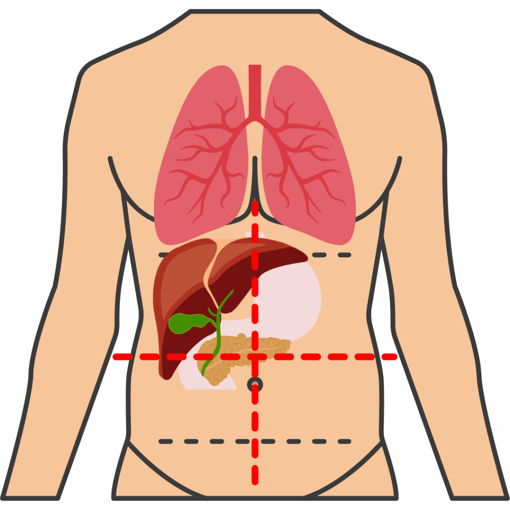 O abdome (popularmente conhecido como “barriga”) pode ser dividido, através de duas linhas imaginárias (uma vertical e outra horizontal, formando uma cruz) em quatro quadrantes, sendo eles: o quadrante superior direito, o quadrante superior esquerdo, o quadrante inferior direito e o quadrante inferior esquerdo. A figura abaixo demonstra essa divisão.